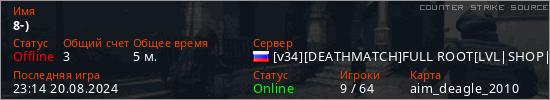Играет на Counter Strike Source сервере. Страна: РоссияПервый раз замечен 23:10 20.08.2024