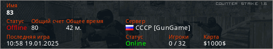 Играет на Counter Strike 1.6 сервере. Страна: РоссияПервый раз замечен 10:27 19.01.2025