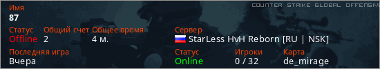 Играет на Counter Strike Global Offensive сервере. Страна: РоссияПервый раз замечен 18:35 04.02.2026