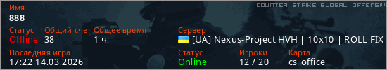 Играет на Counter Strike Global Offensive сервере. Страна: УкраинаПервый раз замечен 21:20 10.03.2026