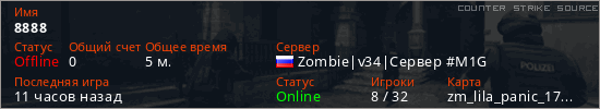 Играет на Counter Strike Source сервере. Страна: РоссияПервый раз замечен 19:36 14.01.2026