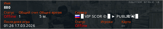 Играет на Counter Strike 1.6 сервере. Страна: РоссияПервый раз замечен 01:22 17.03.2026