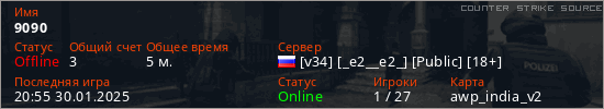 Играет на Counter Strike Source сервере. Страна: РоссияПервый раз замечен 20:22 30.01.2025