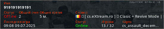 Играет на Counter Strike 1.6 сервере. Страна: РумынияПервый раз замечен 08:49 09.07.2025