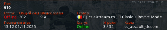 Играет на Counter Strike 1.6 сервере. Страна: РумынияПервый раз замечен 13:53 23.01.2025