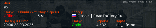 Играет на Counter Strike 1.6 сервере. Страна: РоссияПервый раз замечен 19:49 23.03.2026