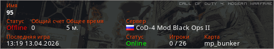 Играет на Call of Duty 4: Modern Warfare сервере. Страна: РоссияПервый раз замечен 13:15 13.04.2026