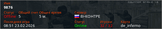 Играет на Counter Strike 1.6 сервере. Страна: РоссияПервый раз замечен 08:49 23.02.2026