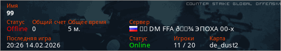 Играет на Counter Strike Global Offensive сервере. Страна: РоссияПервый раз замечен 19:44 14.02.2026
