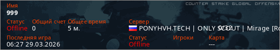Играет на Counter Strike Global Offensive сервере. Страна: РоссияПервый раз замечен 06:04 29.03.2026