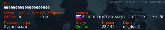 Играет на Counter Strike Global Offensive сервере. Страна: РоссияПервый раз замечен 20:27 03.11.2025