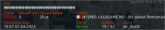 Играет на Counter Strike 1.6 сервере. Страна: РумынияПервый раз замечен 19:39 08.02.2023