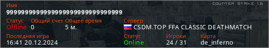 Играет на Counter Strike 1.6 сервере. Страна: РоссияПервый раз замечен 16:39 20.12.2024