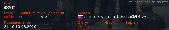 Играет на Counter Strike Source сервере. Страна: РоссияПервый раз замечен 21:40 10.03.2026