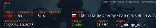 Играет на Counter Strike Global Offensive сервере. Страна: РоссияПервый раз замечен 13:35 14.03.2025