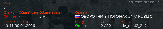 Играет на Counter Strike 1.6 сервере. Страна: РоссияПервый раз замечен 13:39 30.01.2026