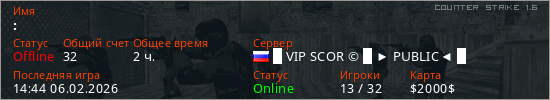 Играет на Counter Strike 1.6 сервере. Страна: РоссияПервый раз замечен 18:04 02.02.2026