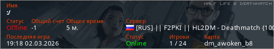 Играет на Half Life 2 DeathMatch сервере. Страна: РоссияПервый раз замечен 19:14 02.03.2026