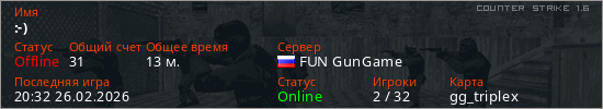 Играет на Counter Strike 1.6 сервере. Страна: РоссияПервый раз замечен 19:29 26.02.2026