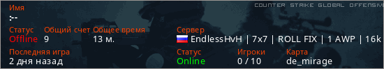 Играет на Counter Strike Global Offensive сервере. Страна: РоссияПервый раз замечен 20:12 02.03.2026