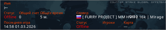 Играет на Counter Strike Global Offensive сервере. Страна: РоссияПервый раз замечен 13:55 01.03.2026