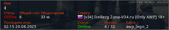 Играет на Counter Strike Source сервере. Страна: РоссияПервый раз замечен 01:03 26.07.2025