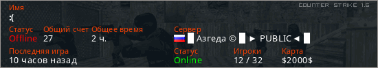 Играет на Counter Strike 1.6 сервере. Страна: РоссияПервый раз замечен 22:03 16.04.2026