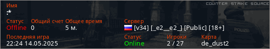 Играет на Counter Strike Source сервере. Страна: РоссияПервый раз замечен 22:22 14.05.2025