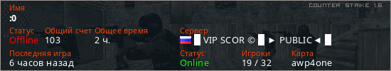 Играет на Counter Strike 1.6 сервере. Страна: РоссияПервый раз замечен 18:06 28.10.2025