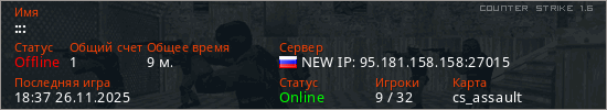 Играет на Counter Strike 1.6 сервере. Страна: РоссияПервый раз замечен 18:17 26.11.2025