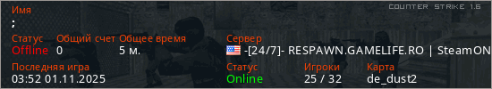 Играет на Counter Strike 1.6 сервере. Страна: СШАПервый раз замечен 03:50 01.11.2025