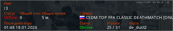 Играет на Counter Strike 1.6 сервере. Страна: РоссияПервый раз замечен 01:29 18.01.2026
