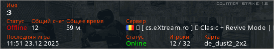 Играет на Counter Strike 1.6 сервере. Страна: РумынияПервый раз замечен 11:43 03.01.2025