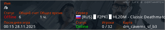 Играет на Half Life 2 DeathMatch сервере. Страна: РоссияПервый раз замечен 22:05 16.11.2025