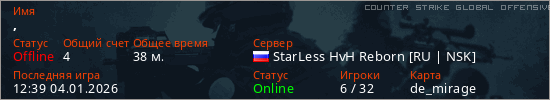Играет на Counter Strike Global Offensive сервере. Страна: РоссияПервый раз замечен 12:31 31.12.2025