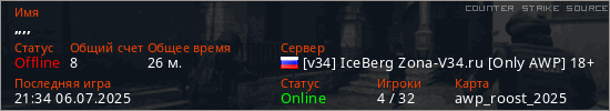 Играет на Counter Strike Source сервере. Страна: РоссияПервый раз замечен 17:51 23.06.2025