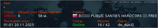 Играет на Counter Strike Global Offensive сервере. Страна: РоссияПервый раз замечен 20:33 25.01.2025