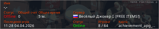 Играет на Team Fortress 2 сервере. Страна: РоссияПервый раз замечен 11:24 04.04.2026