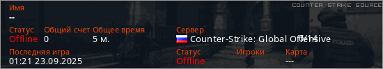 Играет на Counter Strike Source сервере. Страна: РоссияПервый раз замечен 00:54 23.09.2025