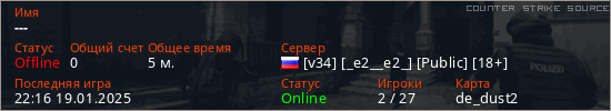 Играет на Counter Strike Source сервере. Страна: РоссияПервый раз замечен 22:03 19.01.2025