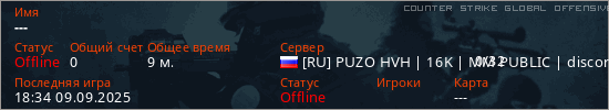 Играет на Counter Strike Global Offensive сервере. Страна: РоссияПервый раз замечен 22:04 27.06.2025