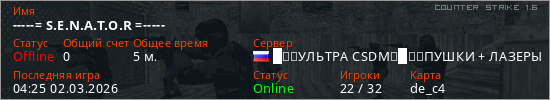 Играет на Counter Strike 1.6 сервере. Страна: РоссияПервый раз замечен 04:21 02.03.2026