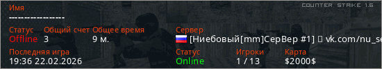 Играет на Counter Strike 1.6 сервере. Страна: РоссияПервый раз замечен 18:42 11.02.2026
