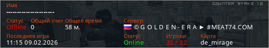 Играет на Counter Strike 1.6 сервере. Страна: РоссияПервый раз замечен 10:19 09.02.2026