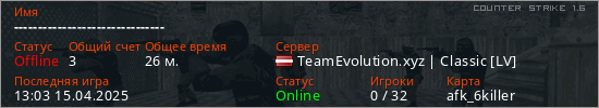 Играет на Counter Strike 1.6 сервере. Страна: ЛатвияПервый раз замечен 13:02 12.04.2025