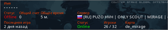 Играет на Counter Strike Global Offensive сервере. Страна: РоссияПервый раз замечен 11:22 16.03.2026
