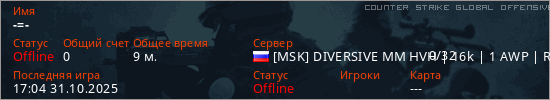 Играет на Counter Strike Global Offensive сервере. Страна: РоссияПервый раз замечен 16:16 29.10.2025