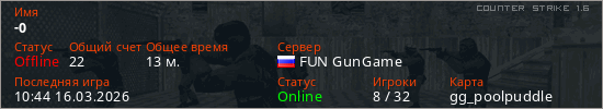 Играет на Counter Strike 1.6 сервере. Страна: РоссияПервый раз замечен 08:57 27.02.2026