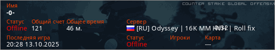 Играет на Counter Strike Global Offensive сервере. Страна: РоссияПервый раз замечен 20:09 02.10.2025