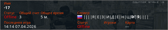 Играет на Counter Strike 1.6 сервере. Страна: РоссияПервый раз замечен 14:10 07.04.2026